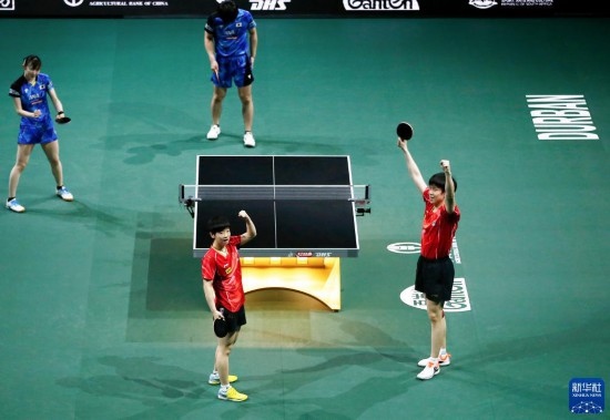 5月26日,王楚欽(右)/孫穎莎在比賽中慶祝。