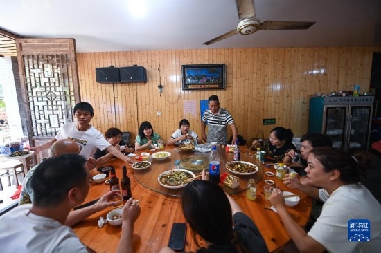 5月30日,游客在布袋坑村的農(nóng)家樂里用餐。