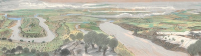 河北塞罕壩林場,是“三北”工程建設(shè)的重要區(qū)域?;脑兞趾5娜眽纹孥E,成為近年來主題性美術(shù)創(chuàng)作的重要課題。入選“筑夢——我們的新時代美術(shù)攝影作品展”的譚智群油畫《美麗的塞罕壩》,是在實地寫生基礎(chǔ)上的藝術(shù)提煉和情感升華。作者以俯視的構(gòu)圖,鋪展?jié)M目蒼翠的美景。畫面左側(cè),清澈的河流蜿蜒向前;畫面右側(cè),白色的雁群逐綠翱翔;遠方,茂密的森林不斷延伸,風(fēng)力發(fā)電機林立于山巔,畫面充滿生機與活力。同樣以俯視的角度處理構(gòu)圖,孔亮油畫《美麗中國——塞罕壩》則以塞罕壩林場和塞罕塔為視覺中心,蔥蘢的綠意,將意境渲染得更加深邃。翁凱旋油畫《滄海桑田——塞罕壩的前世今生》,通過三聯(lián)畫的形式,在新舊對比中構(gòu)建時空長廊,描繪出塞罕壩的時代變遷。