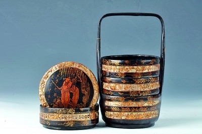 工藝技法與地方名品是漆器展示的兩個脈絡,其中既有日用品,亦有陳設品。福建福州脫胎漆器如“鳳凰牡丹紋瓶”不僅輕巧靈動,且圖案精美,色彩豐富。北京漆器以雕漆見長,造型古樸,裝飾典雅。江蘇揚州漆器兼具螺鈿與雕漆工藝,裝飾頗有文人趣味。福建永春郭振盛所造“金漆彩繪提盒”富有裝飾性,多用于迎神祭祖、民間嫁娶和走親訪友。四川成都“推光漆果盒”以黑地博古圖案表達“壽考神仙”之題,盒內(nèi)分兩圈九格,分髤沉穩(wěn)五色,既實用又美觀。四川涼山彝族漆器則以木為胎,質(zhì)樸粗獷,多髹紅、黃、黑三色,分別象征著勇敢、光明與莊重。在漆器單元的“彝族漆器圖案內(nèi)涵”小專題中,觀眾從自然、動植物、生產(chǎn)生活等多個類別的圖案中得以了解彝族人民對自然的崇拜與敬畏。