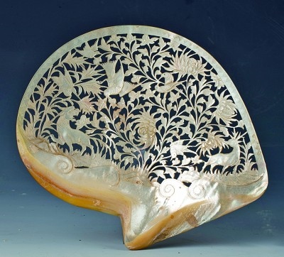 雜項包括景泰藍、錫器、銀器、竹編、草編、木雕、貝殼鏤雕、泥塑等多個門類,名品與新品琳瑯滿目。1951年至1952年,常沙娜在林徽因的指導下設計的北京景泰藍“和平鴿紋盤”“飛天紋盤”等作品,不僅富有敦煌特色,而且探索了傳統(tǒng)工藝設計的轉(zhuǎn)型之路。四川自貢名家龔玉璋的竹絲扇工藝精湛,圖像富有文人雅趣。廣州珍珠殼鏤雕成對展示,造型雅致,色澤瑩潤,工藝精細,裝飾華美。來自天津、潮州等地的木雕糕模造型喜慶,寓意吉祥。江蘇無錫惠山泥人的代表作“大阿?!蔽⑿F坐,迎祥納福。造型小巧的陜西泥哨多為黑地彩繪,形象質(zhì)樸,神情生動,上有兩個小孔,吹之可發(fā)聲。