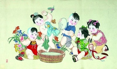 將秦瓊、尉遲恭的門神形象立于展廳中一扇大門的兩側(cè),頓時營造出威嚴的氛圍。參展的年畫多刻印精細,描繪精致,題材分為驅(qū)邪納福、戲曲傳說、世俗生活和新年畫等。天津楊柳青年畫既有名家錢慧安、高桐軒舊版新印的名作,亦有青年畫家創(chuàng)作的新題材,如那啟明表現(xiàn)豐收題材的《金粟碧波》,邵文錦贊頌解放婦女、促進生產(chǎn)的《山鵲別處啼》,張鸞基于傳統(tǒng)年畫《五子奪蓮》創(chuàng)作的愛國衛(wèi)生題材年畫《五子愛清潔》等。濰坊楊家埠以“舊瓶裝新酒”創(chuàng)作新年畫,如《農(nóng)忙托兒所》上題有“爹媽安心去生產(chǎn),加緊建設新中國”。