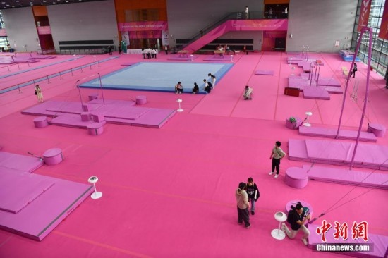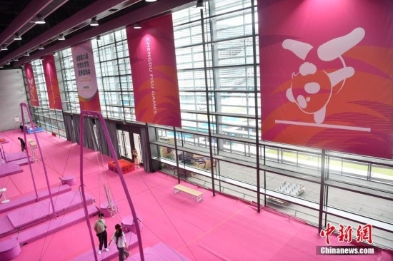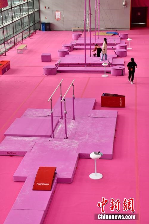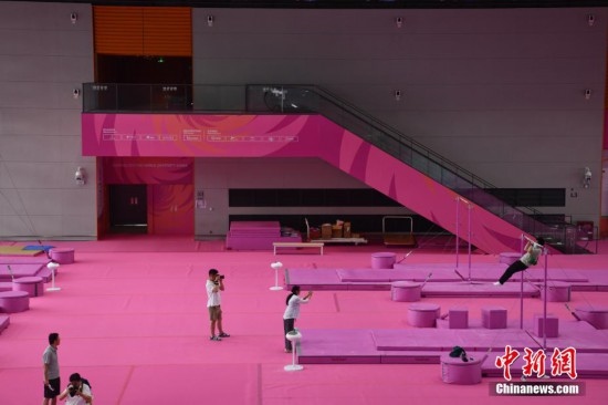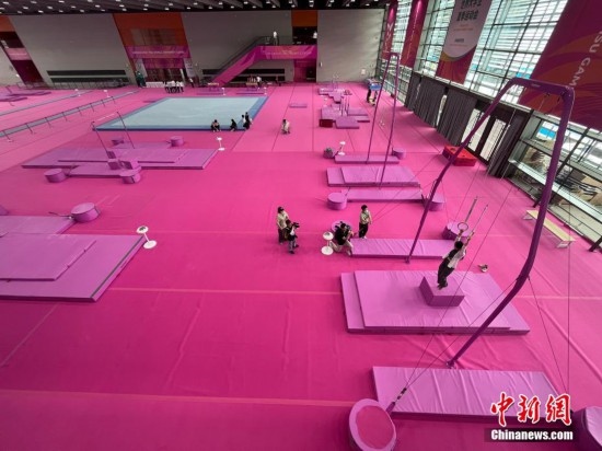 7月14日,成都東安湖體育公園內(nèi),成都大運會體操比賽訓練場的粉色布置吸引媒體記者探訪。海綿墊、平衡木、吊環(huán)、鞍馬等設施均為粉色,充滿青春活力,令人倍感放松。目之所及,海綿墊、平衡木、吊環(huán)、鞍馬等設施均為粉色。
