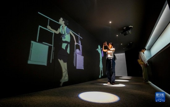 7月31日,演員在《畫(huà)游清明上河――故宮沉浸藝術(shù)展》孫羊店全沉浸光影空間內(nèi)展示宋朝時(shí)期的文化生活。