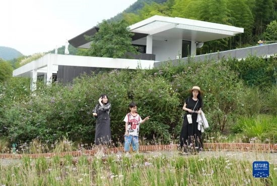 8月8日,游客在余姚市鹿亭鄉(xiāng)一家民宿的花園內(nèi)觀光。