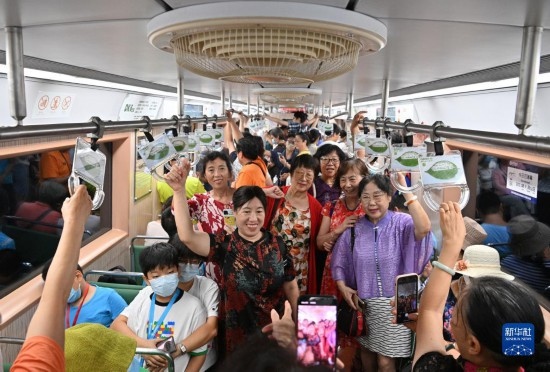 從8月8日起,北京地鐵一號線開行“時光列車”,6節(jié)車廂采用不同時代涂裝風(fēng)格。特別是綠色座椅、車廂頂部風(fēng)扇等元素,帶領(lǐng)乘客瞬間“穿越”,吸引人們紛紛打卡拍照?!皶r光列車”運行時間是工作日14點至15點,運行區(qū)間是地鐵古城站至地鐵復(fù)興門站。