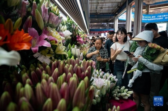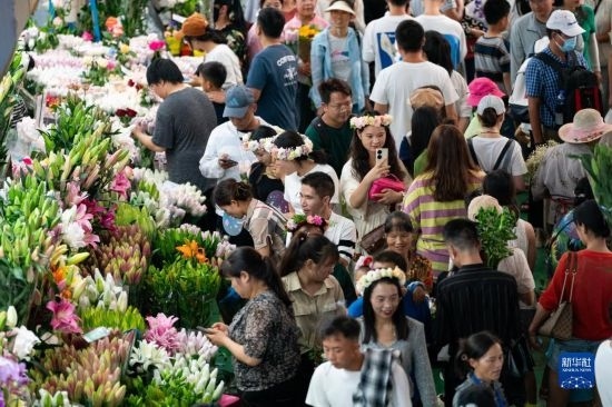 中秋國(guó)慶長(zhǎng)假期間,不少市民游客前往云南省昆明市的斗南花卉市場(chǎng)選購(gòu)鮮花。