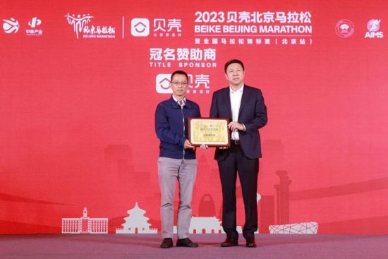 北馬組委會向貝殼副總裁高軍頒發(fā)北馬賽事紀念牌