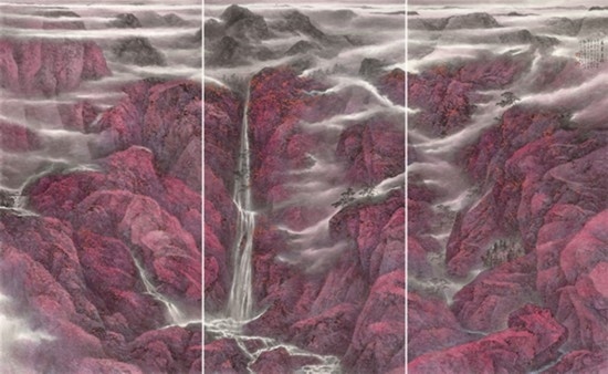 且看樂震文的《直上浮云》《云卷云舒》和《黃土馳風,日月星辰》,那逶迤茫茫的群山峻嶺,那縱橫畫面的云蒸霞蔚,那連綿不絕的箭樓城堞,哪里還是傳統(tǒng)文人山水畫的淡煙輕嵐,縹緲冷逸?濃縮于畫內(nèi)的精神意蘊,分明凸顯了現(xiàn)代山水畫對家國情懷的抒發(fā)。且讀張弛的《云起疊嶂》《惟余莽莽》和《紫氣氤氳》,那天光紫氣的浩渺煙云,那渾然一體的山水氣象,那千回百轉(zhuǎn)的流水飛泉,其實早已脫離了對自然山水的寫照,而是她感悟的時代精神在偌大畫面上的縱橫揮寫、主觀臆造。