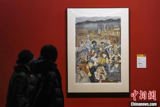 觀眾在江蘇省美術(shù)館展廳內(nèi)欣賞展出的版畫作品。 中新網(wǎng)記者 泱波 攝
