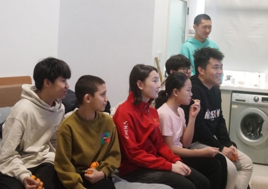 2月9日,努拉娜·阿地力(左三)和教練、隊友們一起觀看電視節(jié)目。