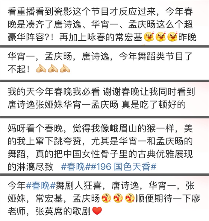 舞蹈迷們發(fā)現(xiàn),今年的春晚舞蹈節(jié)目配置太高,能聚起如此眾多現(xiàn)役頂尖舞蹈家的,也就只有春晚的舞臺(tái)了。但舞蹈節(jié)目的成功除了有頂尖舞者的才華,最重要的,還有創(chuàng)作者的誠(chéng)懇。