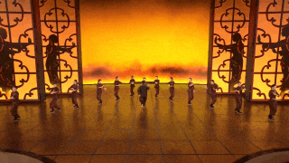 《詠春》來(lái)自舞劇《詠春》選段,已經(jīng)上演了百場(chǎng),但在春晚是個(gè)特別的版本。為了創(chuàng)造出更加意蘊(yùn)豐富的想象空間,總臺(tái)臺(tái)長(zhǎng)慎海雄在推薦這個(gè)舞劇片段時(shí),提出了幾個(gè)建議,包括演員服裝從黑色的香云紗改為絳紅色,男女主角之間的關(guān)系要從男主角一一過(guò)招“大敗”女主角改為相互切磋武藝,開(kāi)場(chǎng)以男主角的武術(shù)剪影來(lái)增強(qiáng)吸引力,通過(guò)使用剪影效果來(lái)展現(xiàn)“葉問(wèn)”的出場(chǎng)。當(dāng)燈光亮起,窗欞上“詠春拳”三個(gè)書(shū)法大字淡去,“葉問(wèn)”的剪影如同舞動(dòng)的水墨畫(huà)一般,隨即演員閃身舞出屏風(fēng),影子與真身共舞。由虛入實(shí),由平面到立體,“剪影”的設(shè)計(jì)讓短短半分鐘的獨(dú)舞大大增加了層次感和觀賞性,為空曠的舞臺(tái)創(chuàng)造出一個(gè)“頂天立地”的葉問(wèn)之影,視覺(jué)震撼瞬間放大,堪稱畫(huà)龍點(diǎn)睛之筆。