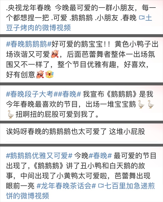 當(dāng)你提“鵝鵝鵝”,自然要期待“曲項(xiàng)向天歌”。駱賓王、唐詩(shī)宋詞、中華文化....看到節(jié)目單上的題目《鵝鵝鵝》,大概很多觀眾都以為是要詠詩(shī)。當(dāng)大幕開(kāi)啟,柴可夫斯基的《天鵝湖》奏起,氣氛瞬間變得端莊典雅了,可接下來(lái)出場(chǎng)的是一群圓滾滾、扭著屁股的小小鵝,這波反差萌,讓網(wǎng)友直呼“創(chuàng)意絕了”。