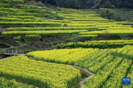3月27日,游客在黃山市徽州區(qū)呈坎鎮(zhèn)靈山村的梯田油菜花海游玩。