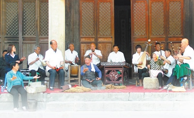 有靜也有動(dòng)。如今,村中常有當(dāng)?shù)卮迕窈头沁z傳承人自發(fā)組織的“中莊秧歌”“打鐵花”等非遺演出,吸引不少游客。在司徒第院內(nèi),樹(shù)齡超400年的臘梅依舊枝繁葉茂。樹(shù)下,一位穿著白大褂、扎著白頭巾的老漢與一旁穿著紅襖藍(lán)裙的老太太一同上場(chǎng),來(lái)到院內(nèi)的月臺(tái)上,一唱一和,用晉城方言演起了節(jié)目。這是村民崔有正、牛玉鳳夫婦,他們?cè)?jīng)是部隊(duì)文藝骨干,現(xiàn)在利用閑暇表演。