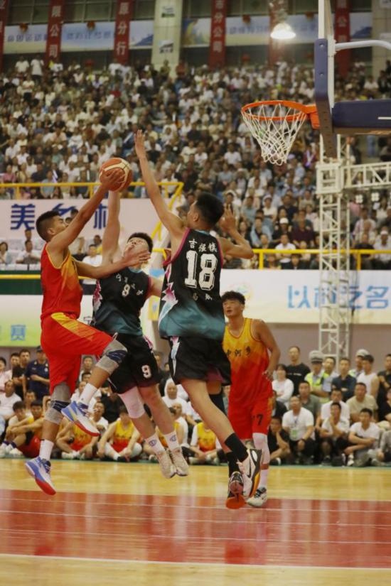 西吉縣吉強(qiáng)鎮(zhèn)代表隊(duì)18號(hào)隊(duì)員馬斌在試圖封蓋對(duì)手的投籃。新華社記者 呂澤 攝