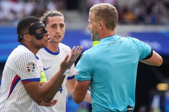 7月1日,法國(guó)隊(duì)球員姆巴佩(左)在比賽中向主裁判申訴。新華社記者 彭子洋 攝