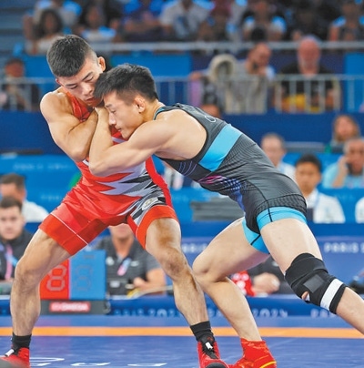 當(dāng)?shù)貢r(shí)間8月6日,中國(guó)隊(duì)選手曹利國(guó)(右)在巴黎奧運(yùn)會(huì)男子古典式摔跤60公斤級(jí)決賽中。環(huán)球時(shí)報(bào)記者 李 昊攝