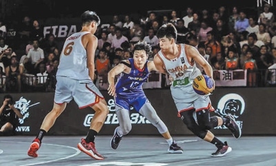 2024國際籃聯(lián)三人籃球國家聯(lián)賽(孝感站),選手在比賽中拼搶。王 亮 袁 鑫攝影報(bào)道