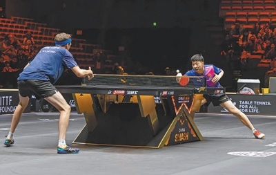 WTT中國大滿貫賽,中國選手馬龍(右)在比賽中。本報(bào)記者 張武軍攝