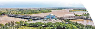 登上三盛公水利樞紐觀景平臺(tái),眼前豁然開朗。黃河宛如一條巨龍,自天際蜿蜒而來(lái),在攔河閘壩的疏導(dǎo)和調(diào)控下,水流變得平緩有序。在這里,黃河被一分為二,一條仍沿主河道逶迤東去,一條則被引入由人工開鑿的總干渠。