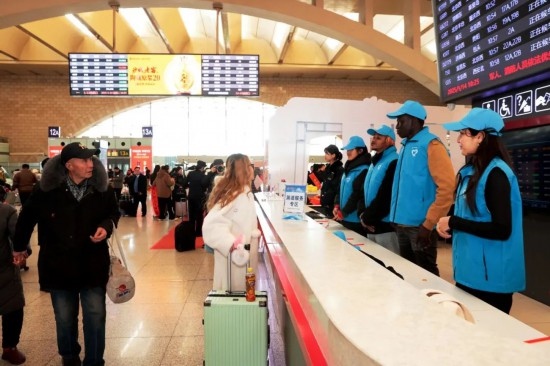 1月14日春運首日,外籍留學(xué)生志愿者走進(jìn)石家莊站為旅客服務(wù)。