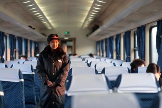 大年三十,成都至北京西的臨客列車上,一位列車員正在貼窗花。