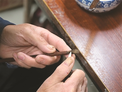 把毛料放在水中仔細(xì)清洗,就著燈光剔除一根根細(xì)微雜毛,將清理后的毛料聚合成圓直光滑、攏抱不散的錐形……走進(jìn)涇縣涇川鎮(zhèn)宣筆制作技藝代表性傳承人佘征軍的工作室,他正在為一支紫毫筆制作筆頭?!鞍拙右子性娫疲侵瞬蔀楣P,千萬毛中揀一毫’。此句講的是宣筆制作工藝的復(fù)雜精細(xì)。”佘征軍說。