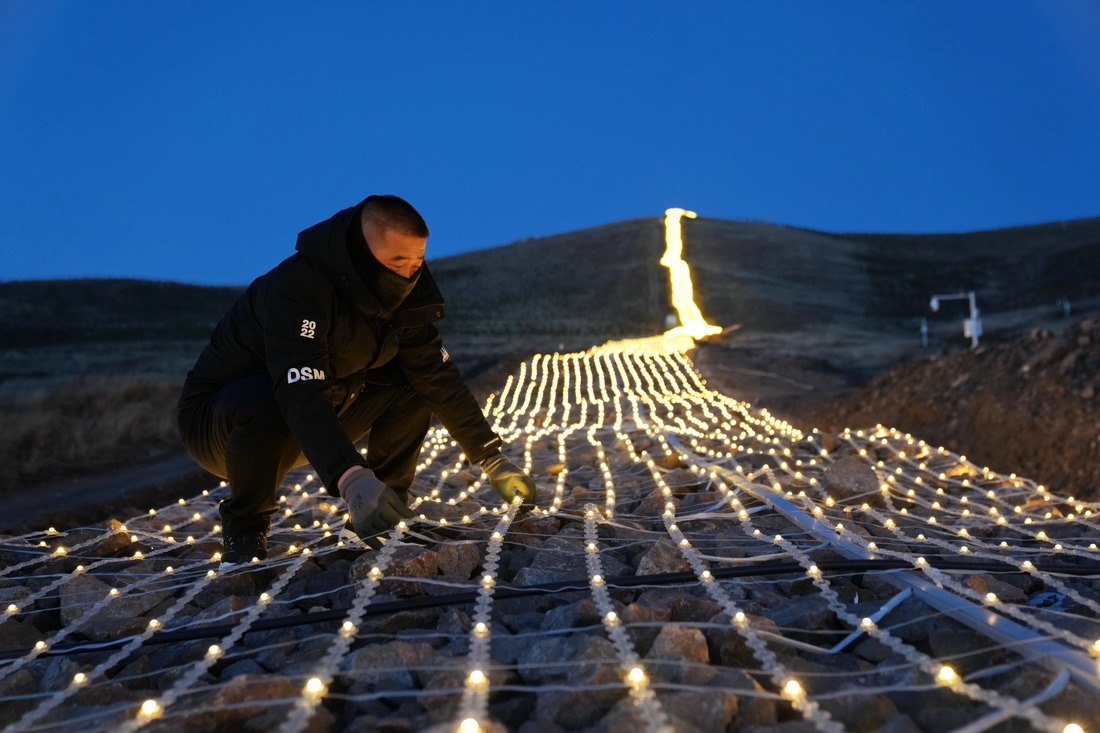 12月30日,工作人員在崇禮長(zhǎng)城景觀展示亮化工程現(xiàn)場(chǎng)檢查燈帶。新華社記者 牟宇 攝