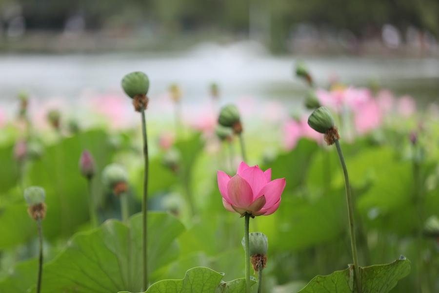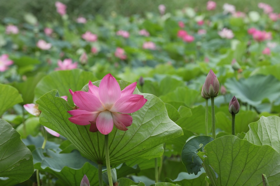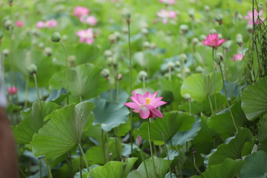 荷花又名蓮花,水芙蓉,為多年生水生植物。根莖(藕)肥大多節(jié),橫生于湖底淤泥中,其花期為6月—9月,7月中旬至8月中旬為最佳觀賞期。