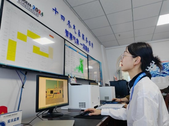 氣象服務(wù)團(tuán)隊(duì)負(fù)責(zé)人王穎正在分析研判天氣情況。新華社記者 張武岳 攝