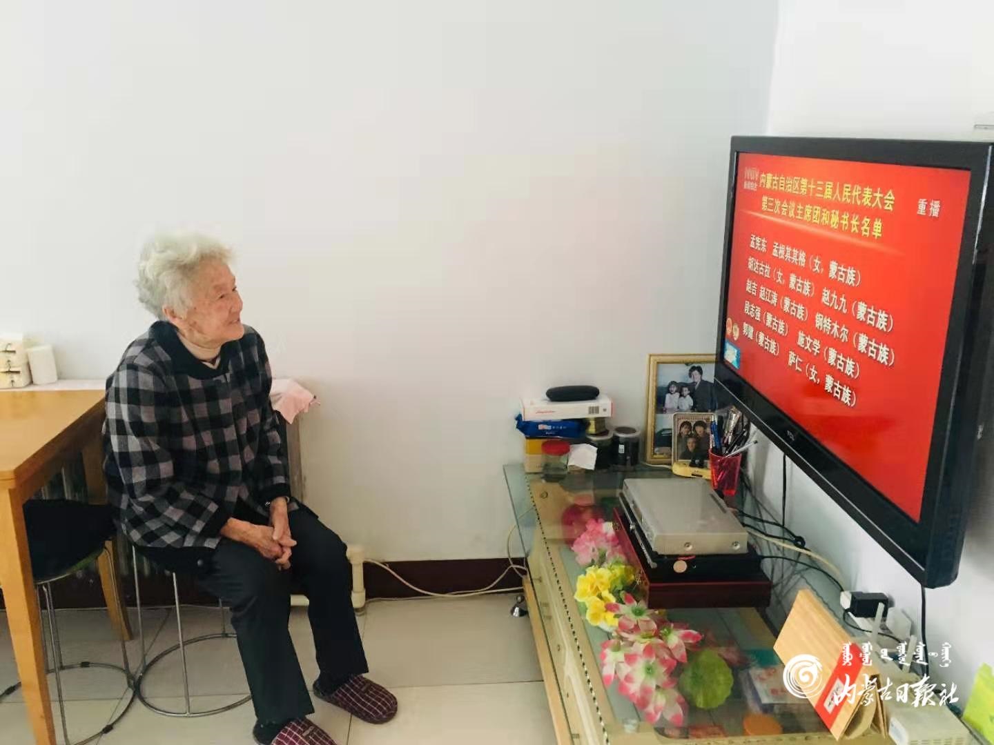 濱河社區(qū)82歲的老黨員田炬恒觀看自治區(qū)十三屆人大三次會(huì)議開幕直播。