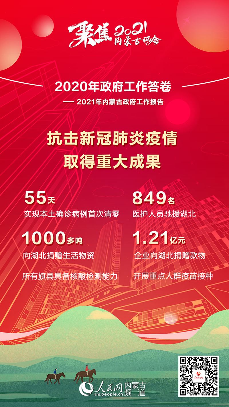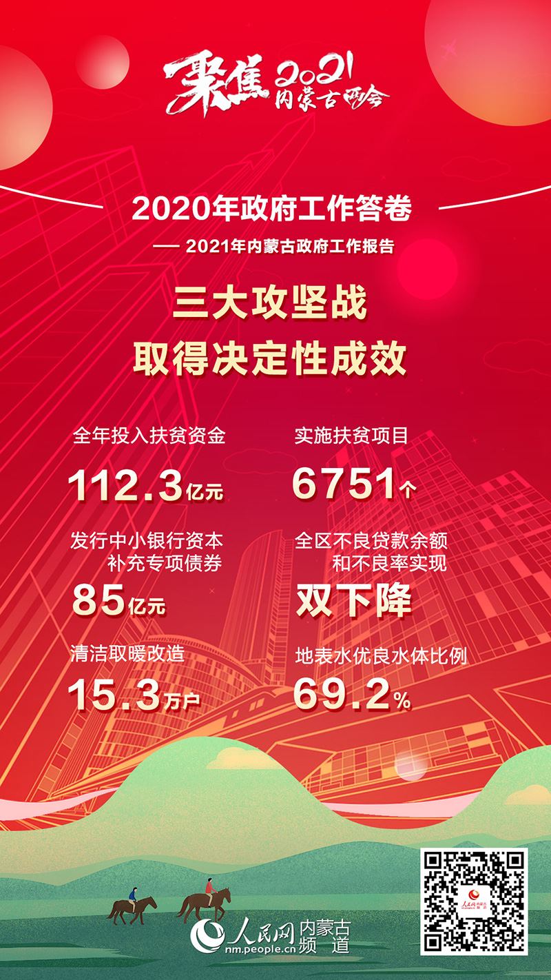 1月26日上午,內(nèi)蒙古自治區(qū)十三屆人大四次會(huì)議在內(nèi)蒙古人民會(huì)堂開幕。自治區(qū)主席布小林作政府工作報(bào)告。2020年是極不平凡的一年,內(nèi)蒙古緊扣全面建成小康社會(huì)目標(biāo)任務(wù),堅(jiān)持穩(wěn)中求進(jìn)工作總基調(diào),堅(jiān)持以人民為中心,科學(xué)統(tǒng)籌疫情防控和經(jīng)濟(jì)社會(huì)發(fā)展,扎實(shí)做好“六穩(wěn)”工作,全面落實(shí)“六?!比蝿?wù),全區(qū)經(jīng)濟(jì)持續(xù)回穩(wěn),社會(huì)大局和諧穩(wěn)定,“十三五”規(guī)劃順利收官。2020年政府工作有哪些亮點(diǎn)?看內(nèi)蒙古書寫這份精彩答卷!