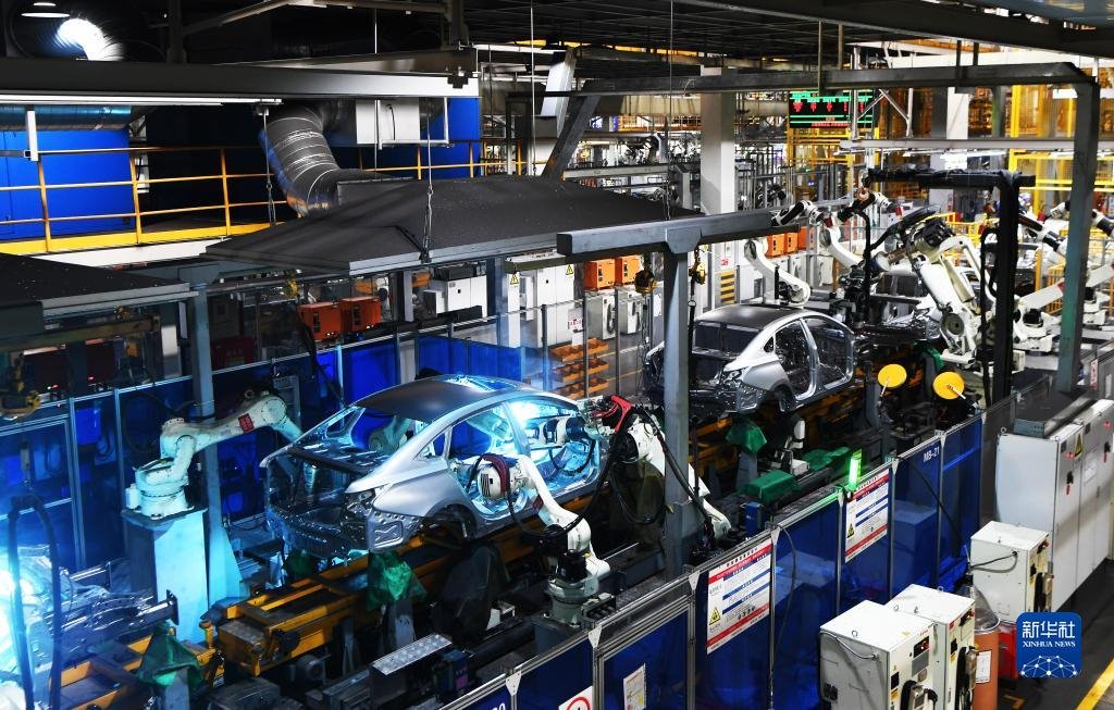 在重慶兩江新區(qū)的長(zhǎng)安汽車兩江智能工廠,工業(yè)機(jī)器人在焊接車間的流水線上作業(yè)(2020年7月21日攝)。新華社記者 王全超 攝
