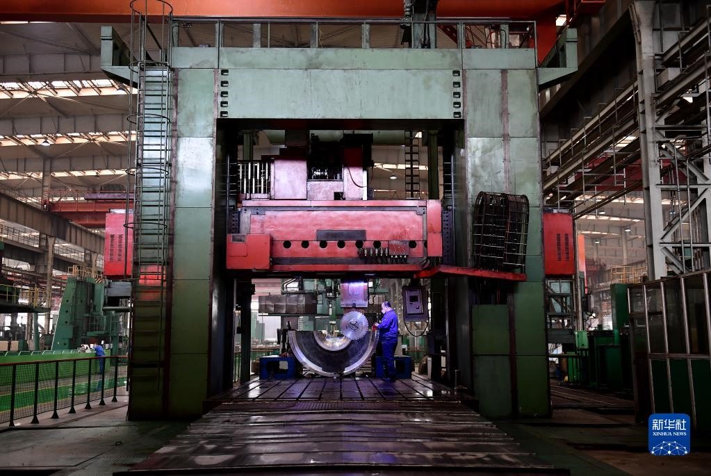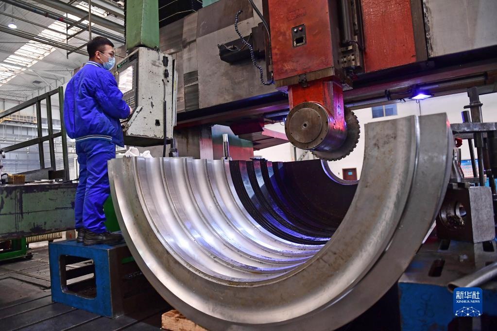 2020年3月16日,在沈陽鼓風(fēng)機(jī)集團(tuán)股份有限公司生產(chǎn)車間,工人操作機(jī)器加工產(chǎn)品內(nèi)機(jī)殼。新華社記者 楊青 攝