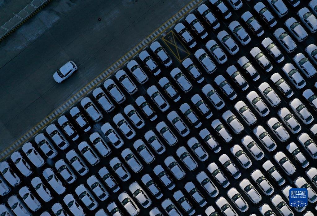2021年1月29日,一輛運送中的商品車行駛在大連港汽車碼頭(無人機(jī)照片)。新華社記者 姚劍鋒 攝