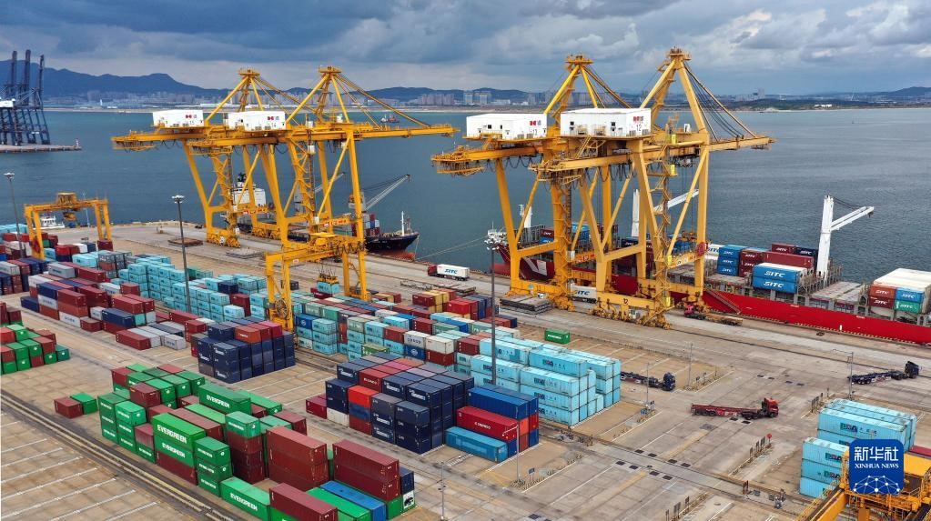 2020年9月24日,貨輪在大連港大連集裝箱碼頭有限公司港口裝卸集裝箱(無人機(jī)照片)。新華社記者 姚劍鋒 攝